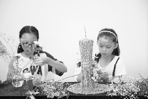 参赛的小选手认真制作花艺作品。