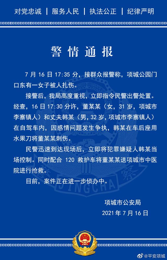 接警后,我局高度重视,立即指令民警出警处置。经查,16日17:30分许,董某某(女,31岁,项城市李寨镇人)和丈夫韩某(男, 32岁,项城市李寨镇人)在自驾车内,因感情问题发生争执,韩某在车后座用水果刀将董某某刺伤。