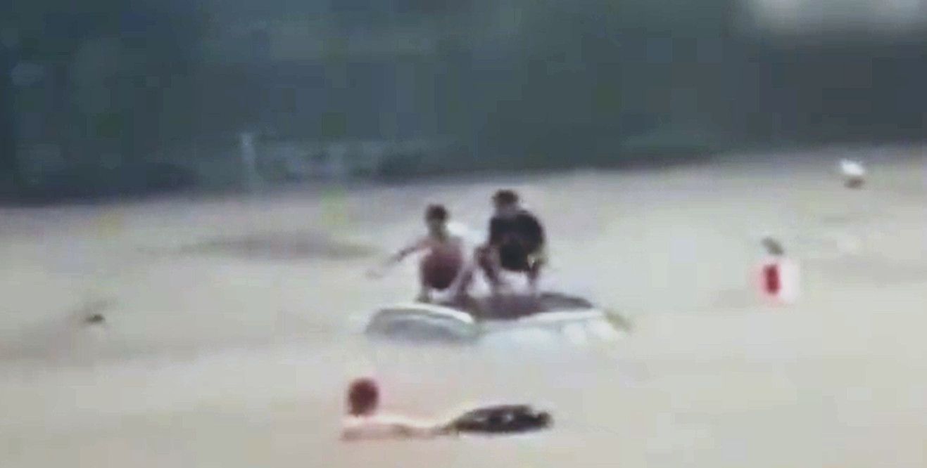 暴雨中,一辆SUV被困在积水的路段上,驾驶车辆的是一位老妇人,车里载着他的外孙和外孙女。水势涨得很快,不大一会儿就没过了坐在驾驶席上的老人的膝盖,由于大水带来的车辆内外压力差,车门无法打开。