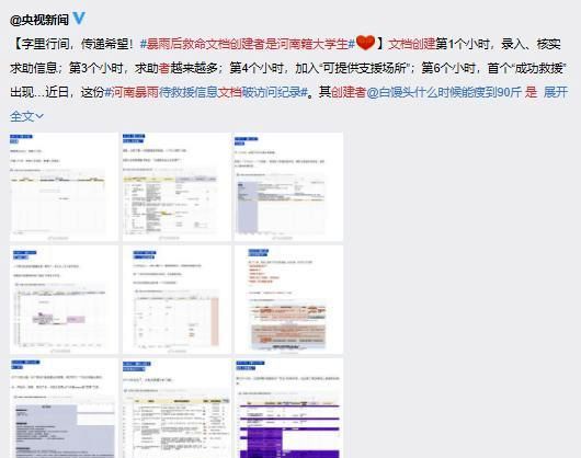 一位名叫李睿的大学生组织自己的同学,创立了一份待救援人员信息的在线文档,他们争分夺秒的搜集待救援人员的情况、核实信息、筛选信息、联系被困者、更新文档……没日没夜的熬了几天几宿,为各方救援队伍提供了实时资料,更为一条条生命换来了宝贵的时间。