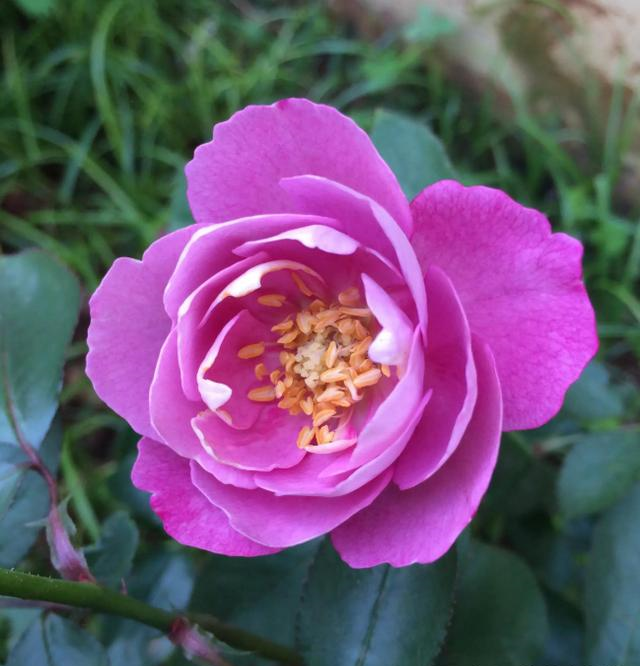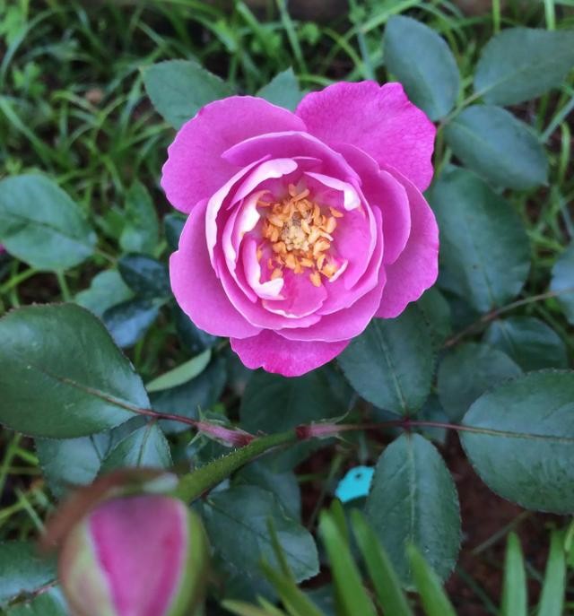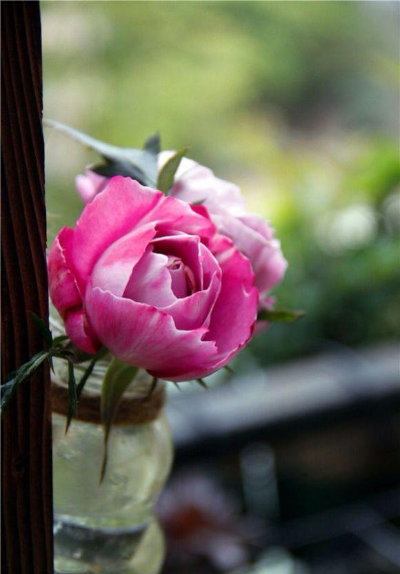 这株羊脂香水月季养了大约十天左右,两朵花陆续的开了。花瓣不多,但层次感很强,花色也不是传说中的紫色,偏玫红色一点,花朵直径四厘米,香味很浓。第一朵花开了以后我就剪了,拿来扦插,毕竟苗子有些弱,扦插开了三天,香味越来越淡。第二朵花开了以后刚好遇上个大晴天,早上还开得好好的,中午一晒就蔫了,不知道是不是苗子小的缘故。总之有点失望,如果只是半日花,就太亏了。