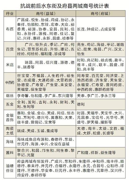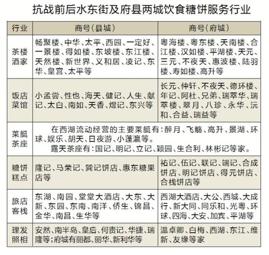 在百货行业中,本地人约占九成,较有代表性的是亚东苏杭店和恒升贞苏杭店。亚东苏杭店于1936年在县城水东街平二坊开业,经营苏杭百货零售,1942年迁至水东街平一坊继续经营,员工增加到七八人,生意越做越大,商品除销本地外,还批发到东西两江,客户群很广,全年营业额近20万港元。