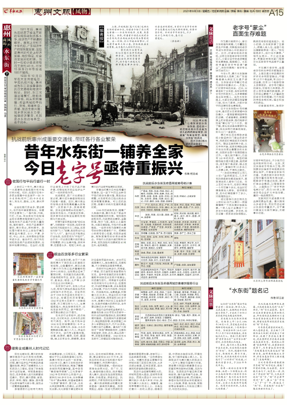 上期,羊城晚报《惠州文脉》追溯水东街的前世今生,向读者介绍了东江商业重镇——水东街的起源、发展、衰落与重生。本期,将着重介绍在抗战前后水东街及府县两城出现的商业繁荣现象。这一时期,东江河道运输繁忙,行业商号遍布大街小巷,货物琳琅满目的景象,成为惠州人的时代记忆。