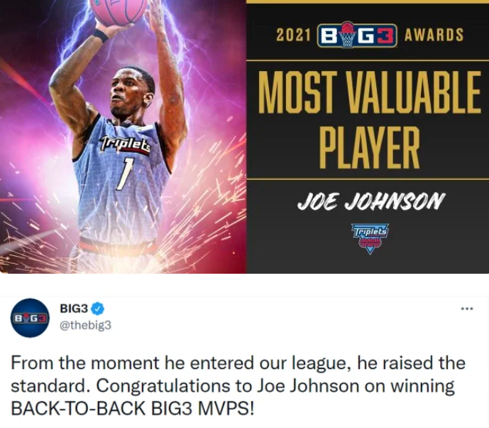 北京时间9月5日,NBA自由市场上又多了一个悍将,那就是乔约翰逊,根据最新消息,BIG3联赛官方宣布,40岁的乔约翰逊当选2021年的最有价值球员(MVP),荣耀!证明了他宝刀不老。