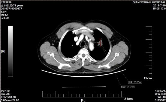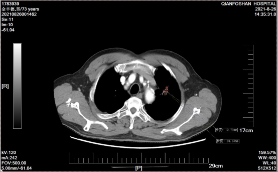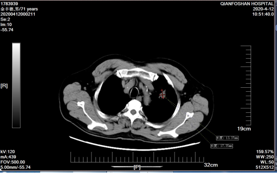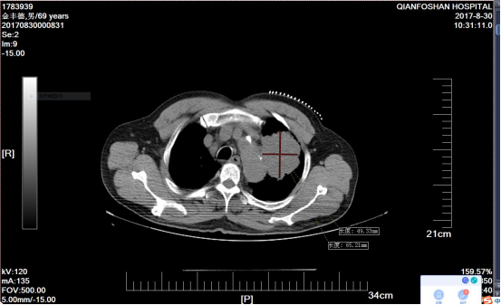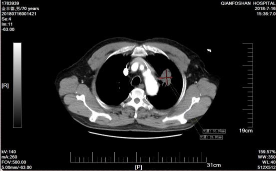 李老伯术前肿瘤CT影像图经过李老伯的子女辗转打听,在确诊一周后李老伯便来到山一大一附院。“肺鳞癌又称肺鳞状上皮细胞癌,是我国最常见的肺癌类型之一,多见于老年男性,与吸烟有密切关系。”医院肿瘤微创科主任医师刘元水表示,众所周知,手术、放疗、化疗被称为癌症治疗的三板斧。因为发现较晚,患者左肺部肿瘤达6.4cm x 5.3cm并侵犯了主动脉弓,已经失去了手术指征,且肺鳞癌对放疗、化疗不敏感,治疗效果有限。