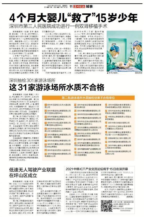 9月9日,市卫健委公布了深圳市人工游泳场所水质第二批次专项抽检结果。第二批次共抽检游泳场所301家,检测指标为游离性余氯、浑浊度、尿素、pH 值、菌落总数、大肠菌群等六项。抽检的 301家游泳场所中,深圳市花园格兰云天大酒店游泳池等 31 家不合格。卫生监督部门已责令抽检结果不合格单位立即整改。