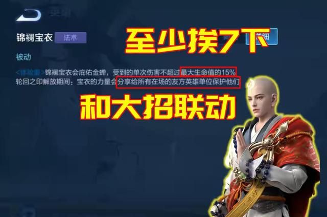 金蝉的被动技能叫锦襕宝衣,能让金蝉成为最离谱的英雄,也正是因为这个被动技能。锦襕宝衣会庇佑金蝉,受到单次伤害不超过最大生命的15%,轮回之印释放期间,宝衣的力量会分享给所有在场的友方英雄单位保护他们。