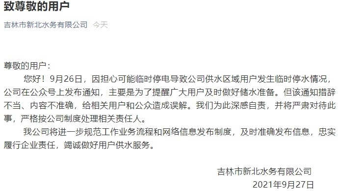 9月27日,吉林市新北水务有限公司通过其微信公众号发布声明称,此前发布的停水通知措辞不当,对此深感自责。