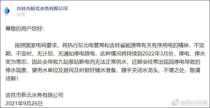 此前,9月26日,该公司发布通知称,“不定期、无计划、无通知停电限电,此种情况将持续到2022年3月份,停电、停水变为常态”。