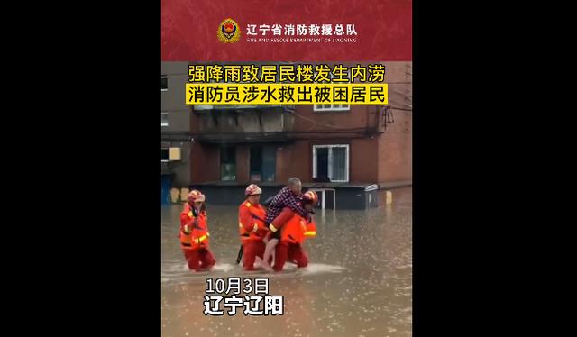 10月3日,辽阳市文圣区东京陵乡因强降雨导致居民楼严重积水,前往救援现场的道路已被积水完全覆盖。居民楼内有多名被困人员需要紧急转移。接到求助信息后,辽阳消防救援支队指挥中心立即调派文圣大队安康路消防救援站前往救援。安康路消防救援站出动1车5名指战员赶往现场开展救援。到达现场后,消防指战员发现通往住宅楼的道路已经完全被积水淹没,最深处超过1.5米,指挥员带领战斗员穿着救生衣携带漏电探测仪前往被困群众所在地,采用抬、背、抱等方式将被困群众转移到安全地带。整个救援历时三个多小时,来回往返十余次,疏散被困群众十余名。