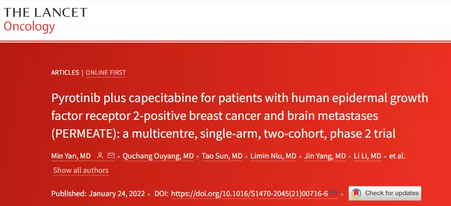 [1] Yan M, Ouyang Q, Sun T, et al. Pyrotinib plus capecitabine for patients with human epidermal growth factor receptor 2-positive breast cancer and brain metastases (PERMEATE): a multicentre, single-arm, two-cohort,phase 2 trial. Lancet Oncol 2022; published online Jan 24. https://doi.org/10.1016/S1470-2045(21)00716-6.