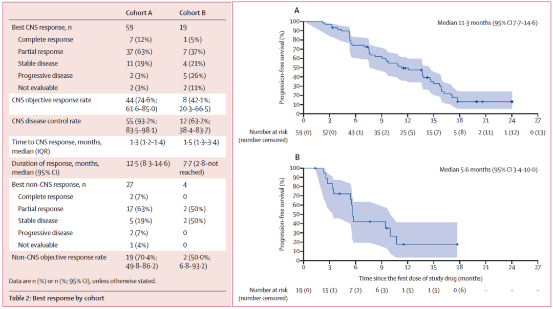 图:主要终点CNS-ORR(队列A 74.6%,队列B 42.1%)和次要终点PFS(队列A 11.3m,队列B 5.6m)结果
