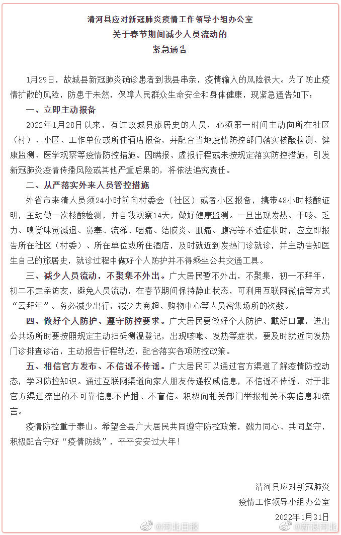 疫情防控重于泰山。希望全县广大居民共同遵守防控政策,戮力同心、共同坚守,积极配合守好“疫情防线”,平平安安过大年! #1月31日河北新增本土确诊病例4例# (清河发布)