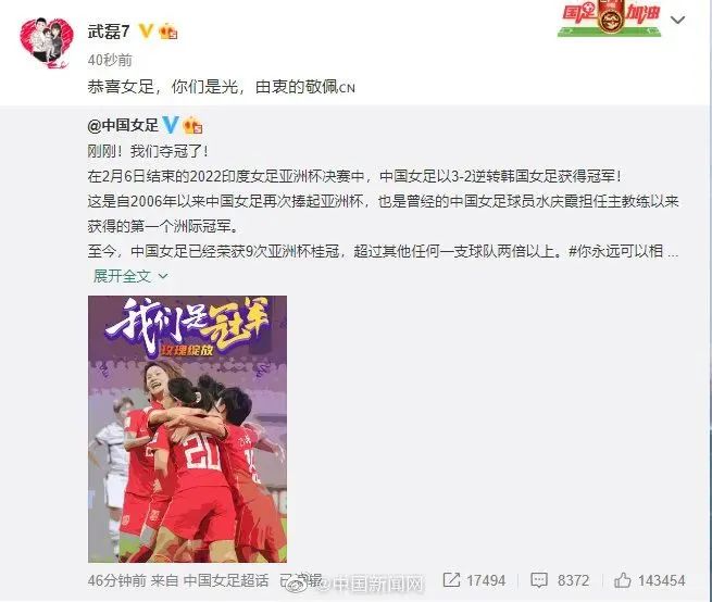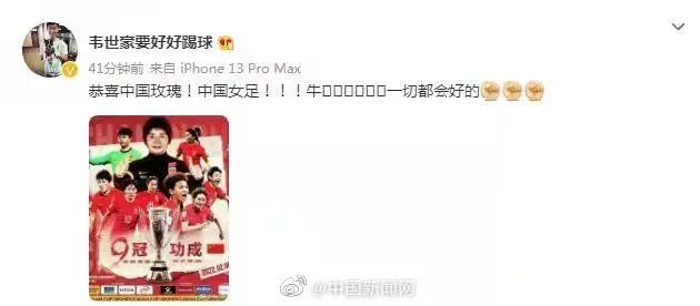 网传热图赛后多位中国男足国脚发文祝贺女足夺冠:“你们是光”“女足已站在亚洲之巅”!