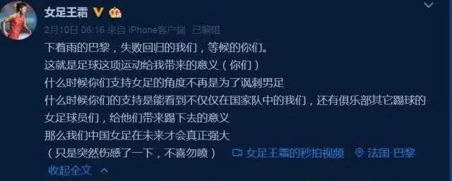2019年2月10日,女足队员王霜曾在微博中写了一段感慨,满腔无奈,又仿佛有先见之明:“什么时候你们支持女足的角度不再是为了讽刺男足。什么时候你们的支持是能看到不仅仅在国家队中的我们,还有俱乐部其他踢球的女足球员们,给他们带来踢下去的意义。那么我们中国女足在未来才会真正强大。”