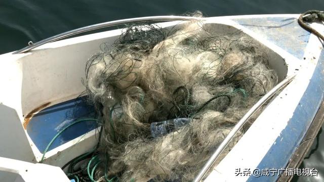 执法人员将绳子收缴后,在周边还发现一些漂浮在水面的塑料瓶,经验丰富的执法人员告诉记者,这些就是渔民下网的“标记”。执法人员站在船头,捞起瓶子后,一手收线、一手拉网,很快就将一幅渔网捞了起来。